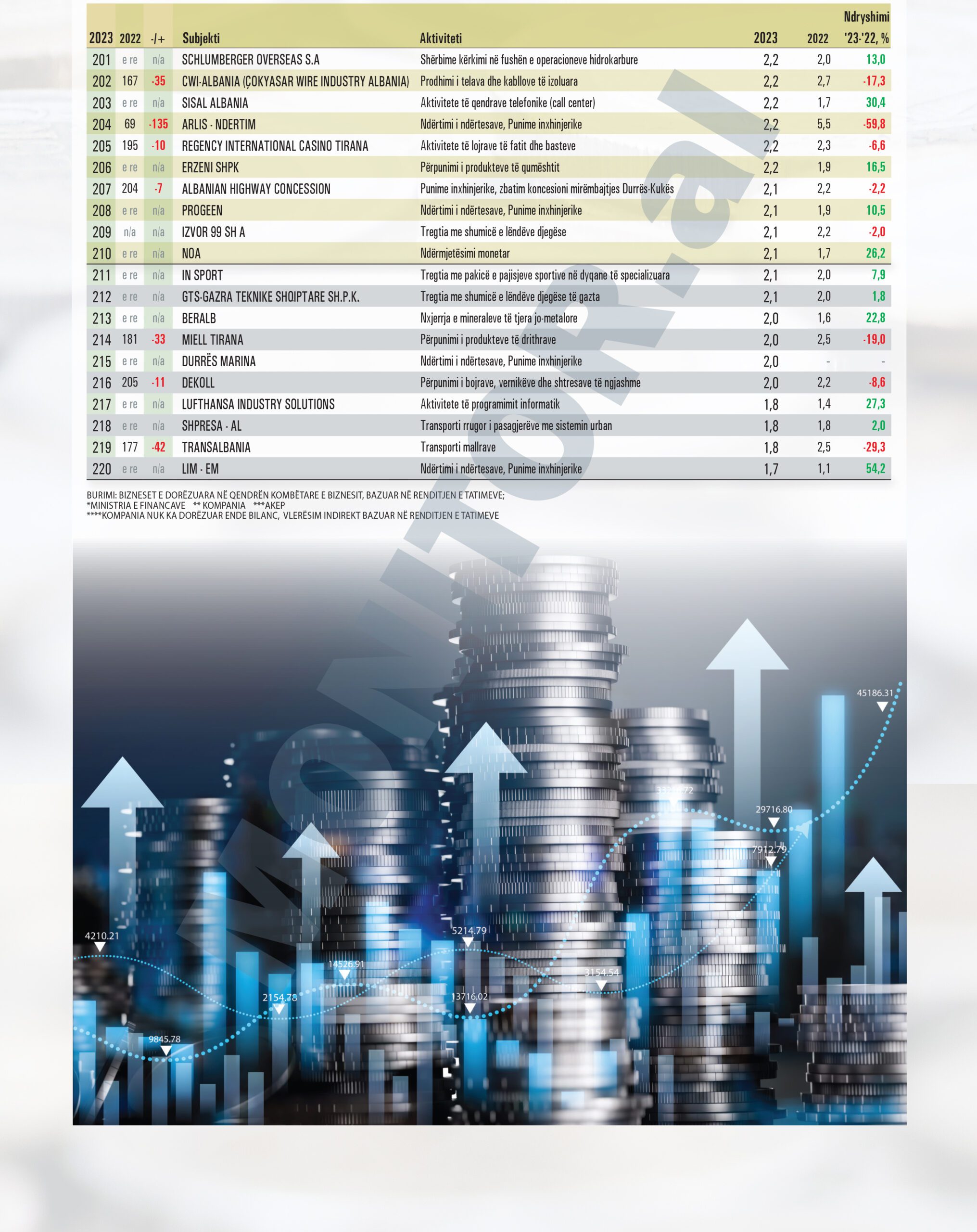Renditja e kompanive më të mëdha në vend, sipas qarkullimit vjetor, “Monitor 200”, për vitin 2023. Rritja e të ardhurave u ngadalësua për shumë sipërmarrje. Ekonomia thelloi problemet e saj strukturore, duke shtuar varësinë nga importet, teksa Euro po godet gjithnjë e më shumë sipërmarrjet prodhuese dhe eksportuese. Ndryshimet demografike dhe emigracioni po shkaktojnë zhbalancime të mëdha në tregun e punës, që vetëm sa vijnë e thellohen. Bizneset duket se po dorëzohen gjithnjë e më shumë përballë kësaj situate, teksa në mungesë të fuqisë punëtore dhe përballë kostove në rritje, po shfaqen pesimiste për zgjerimin dhe investimet në të ardhmen