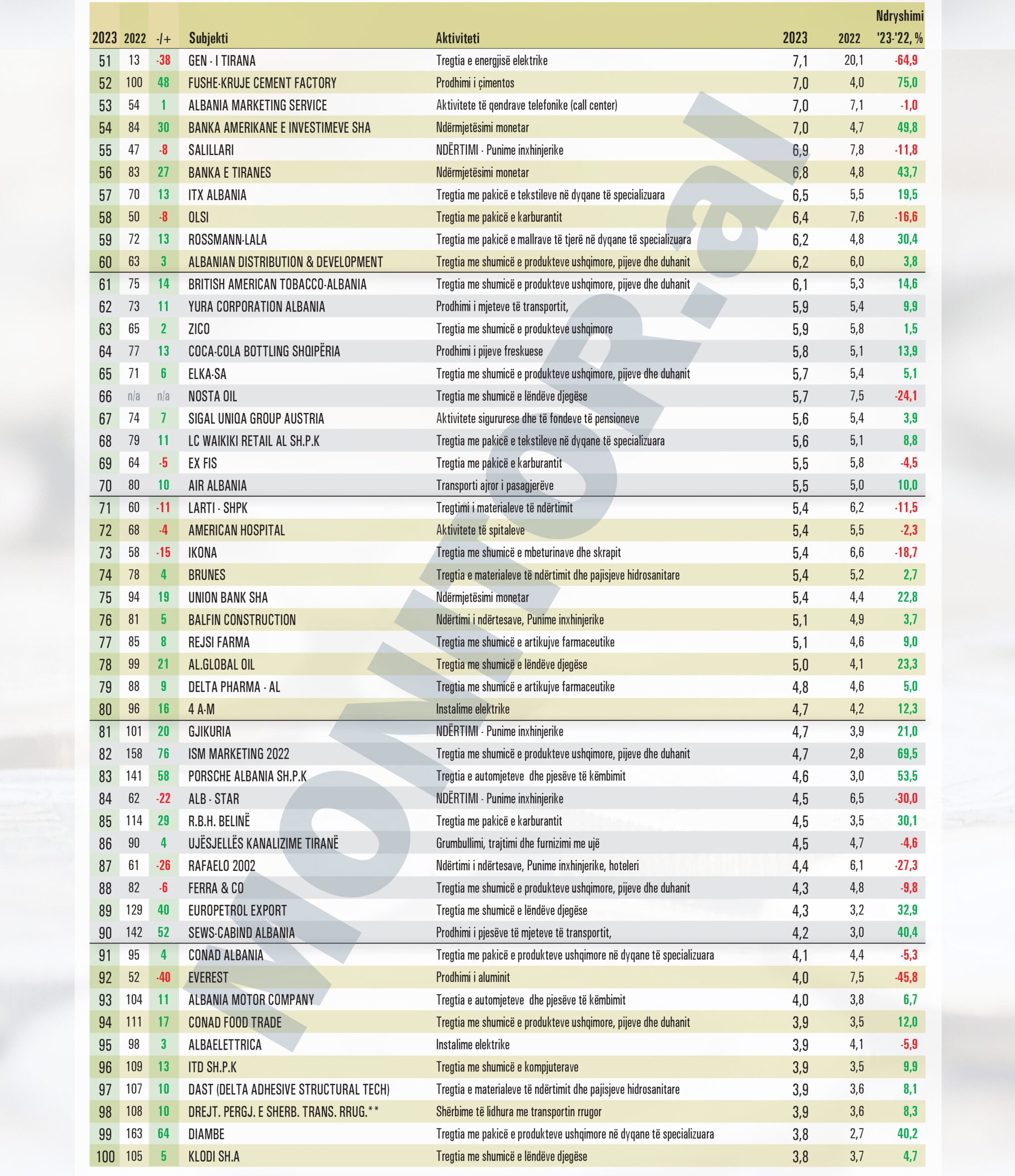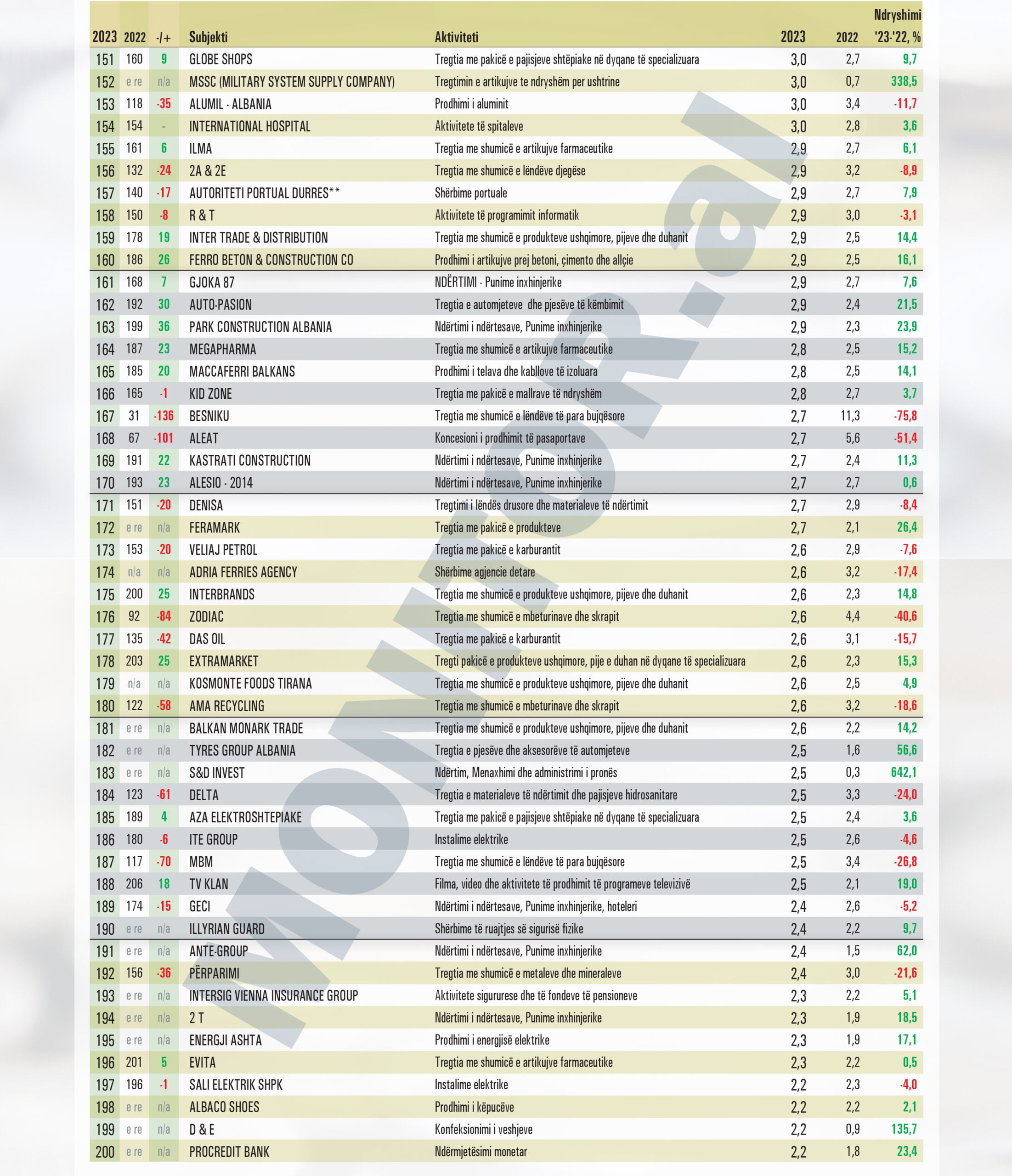 Edhe në vitin 2023, në renditjen e 200 më të mëdhave, mbizotërojnë sipërmarrjet tregtuese e shpërndarëse, që kanalizojnë importet pranë konsumatorit lokal. Vetëm një duzinë kompanish kanë aktivitet në industrinë përpunuese.