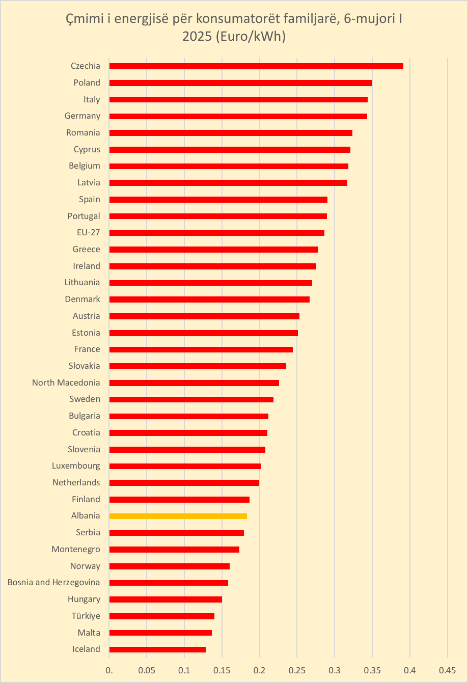 Në raport me vendet e Europës, Shqipëria ende ka çmime të favorshme për energjinë elektrike ndaj konsumatorëve familjarë, por krahasuar me rajonin, ka çmimet më të larta pas Maqedonisë së Veriut.