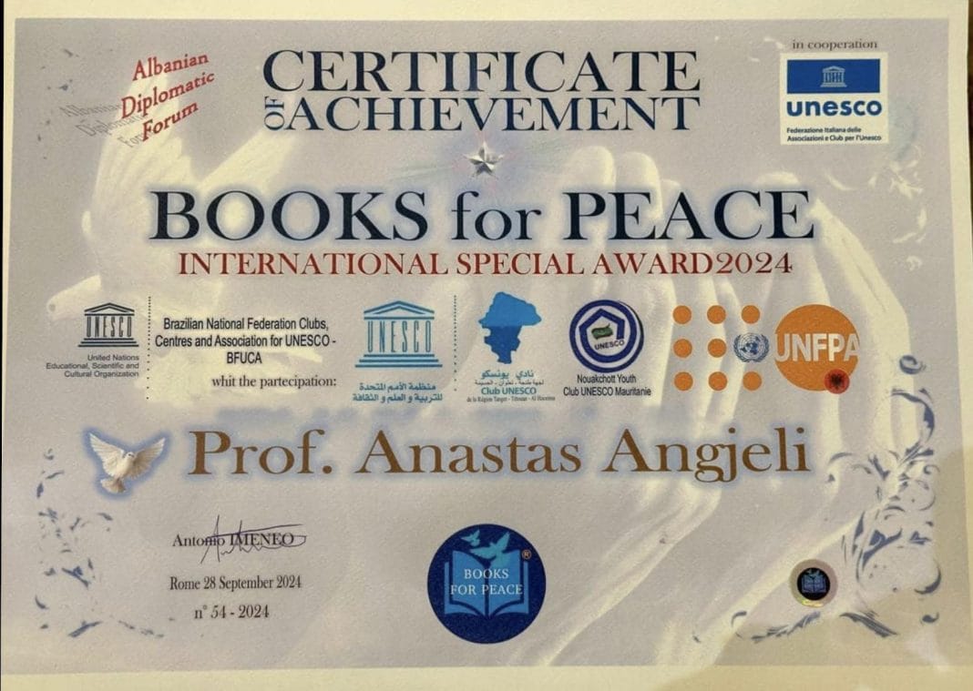 Presidenti i Universitetit Mesdhetar të Shqipërisë, Akademik Prof. Dr. Anastas Angjeli vlerësohet me çmimin ndërkombëtar për kontributin e tij në dobi të paqes.Gjatë një ceremonie të veçantë në Godinën e Parlamentit Europian të Italisë, Piazza Venezia të Romës, në sallën David Sassuoli, Akademik Prof. Dr. Anastas Angjeli u vleresua me çmimin ndërkombëtar “Books for Peace 2024” për kontributin e vyer në shërbim të paqes.Kjo ceremoni përmbylli konferencën e organizuar nga Organizata ndërkombëtare Books for Peace, UNIFUNVIC UNESCO CLUBS BRAZIL BUCA / EUROPE, në bashkëpunim me Universitetin Mesdhetar të Shqipërisë, Ambasadën e Shqipërisë në Vatikan, Forumin Diplomatik Shqiptar dhe Gazetën Diplomatike Italiane. Konferenca me temën “Qytetarët e botëa, kultura për një paqe të shëndoshë dhe të qendrueshme” u hap nga Akademik Prof. Dr. Anastas Angjeli. Në fjalën e tij me temën “ Paqja dhe zhvillimi i qendrueshëm: Prosperitet global për qytetarin global” ai evidentoi lidhjen e thellë midis zhvillimit të qendrueshëm dhe paqes e karakterin shumëplanësh të saj, duke nënvizuar rëndësinë e ndërlidhjes dhe bashkëpunimit si dhe qasjet e integruara të zhvillimit të qëndrueshëm. Mundësitë dhe sfidat e sotme të zhvillimit dhe paqes së qëndrueshme përmbyllën prezantimin shkencor të Akademik, Prof Dr. Anastas Angjelit në këtë konferencë të rëndësiahme.