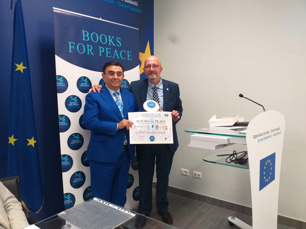Prof. Antonio Imeneo, Presidenti i Organizata ndërkombëtare Books for Peace, i dorëzoi çmimin Akademik, Prof Dr. Anastas Angjelit në praninë e një audience të zgjedhur vendase e ndërkombëtare, politike, diplomatike dhe përfaqësues të medias.