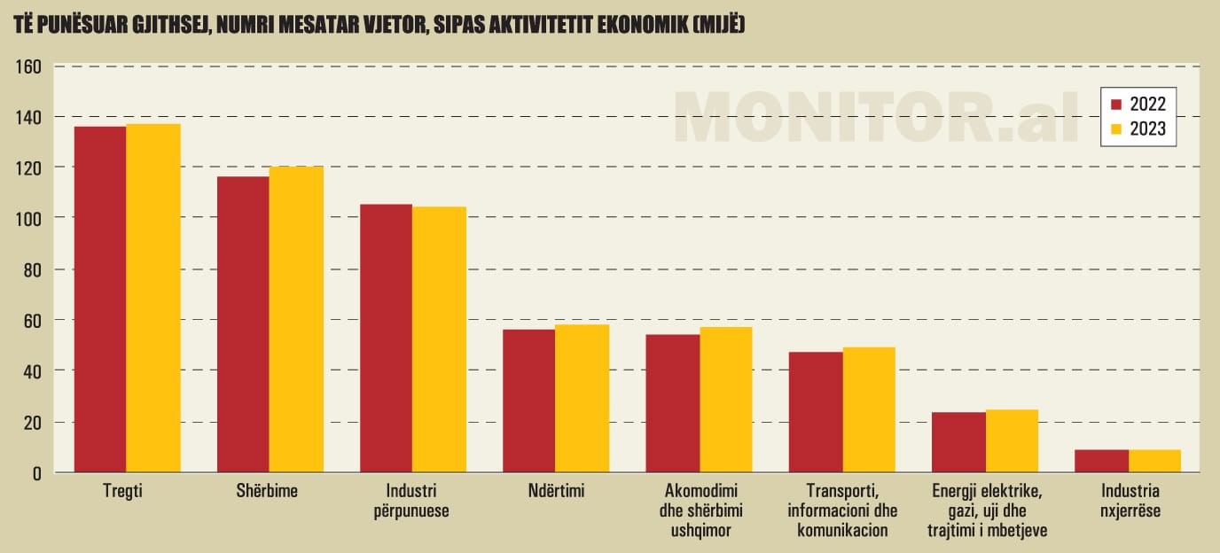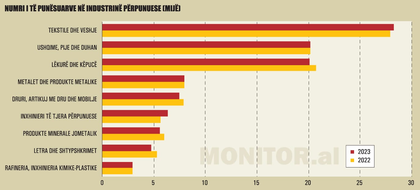 Peshën kryesore në punësimin e industrisë përpunuese e ka aktiviteti i “tekstile e veshje” (28.3 mijë) e ndjekur nga “ushqime, pije dhe duhan” (20 mijë) dhe “lëkurë e këpucë”, po rreth 20 mijë, të tre këta sektorë raportojnë rënie, të ndikuara nga Euro e dobët që ka goditur sidomos eksportet e tekstileve dhe këpucëve, konkurrenca nga importet që po e ndien agroindustria.