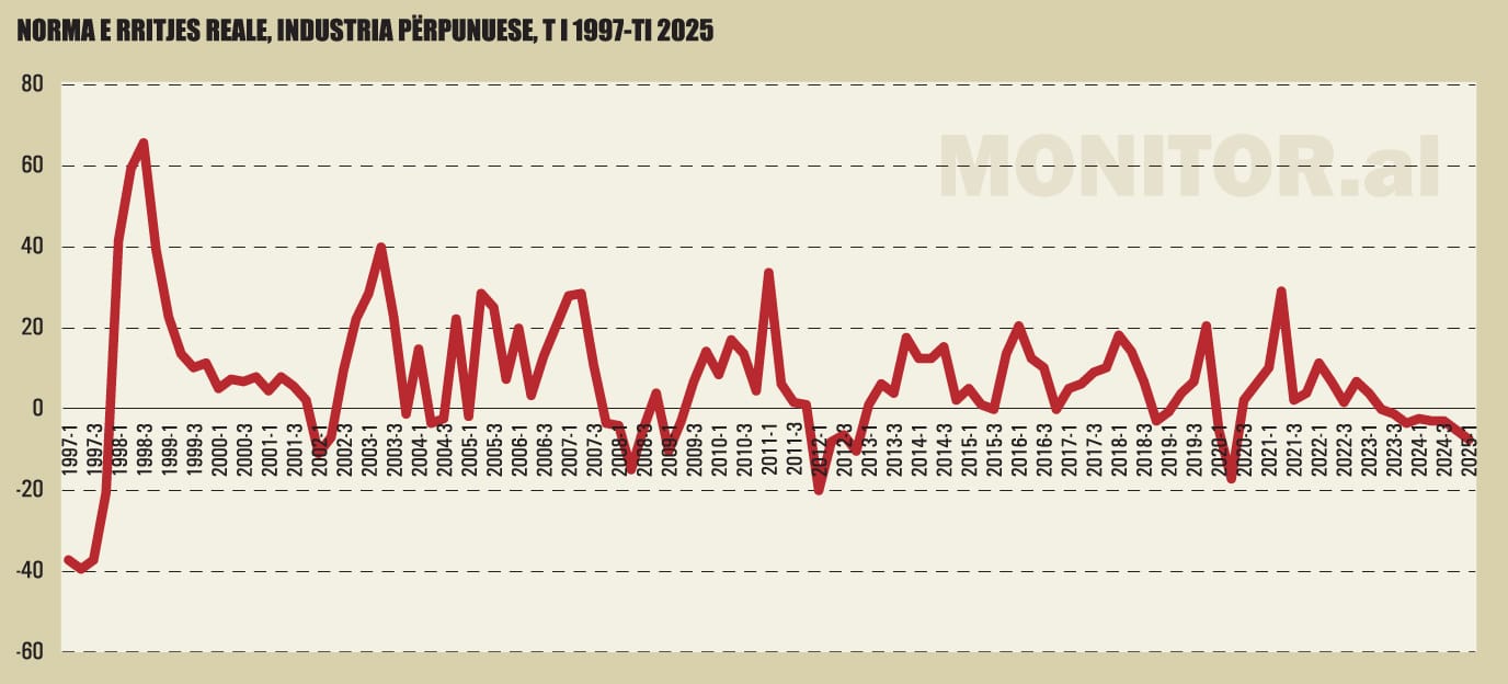 Dy vitet e fundit, industria përpunuese ka shënuar vetëm rënie, për tetë tremujorë radhazi, duke kulmuar në janar-mars 2025, me një tkurrje prej 7.6%.