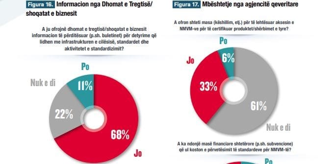 Bizneset perceptojnë se dhomat e tregtisë dhe shoqatat e biznesit nuk ofrojnë informacion të përditësuar mbi legjislacionin e produkteve. Gjithashtu, qeveria nuk arrin të mbështesë operatorët ekonomikë me informacionin e nevojshëm dhe ndihmën financiare në këtë fushë”.