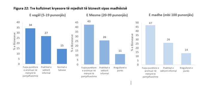 Shqetësimi i tretë më i rëndësishëm është barra e lartë taksave. Ndërkohë, bizneset e mesme dhe ato të mëdha duken më pak të shqetësuara nga vlera monetare e taksës dhe më shumë nga burokracia e rregulloreve të punës. Kjo tregon se për ndërmarrjet me mbi 100 punonjës, pengesa nuk është vetëm kostoja financiare, por ngurtësia e ligjeve dhe procedurave që vështirësojnë menaxhimin e burimeve njerëzore në një treg që kërkon fleksibilitet.