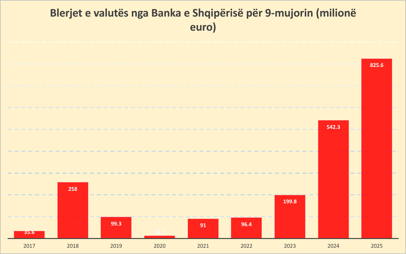 Sipas të dhënave zyrtare të publikuara deri tani, për nëntë muajt e parë të vitit 2025 Banka e Shqipërisë ka blerë gjithsej 825.6 milionë euro në tregun e brendshëm valutor.