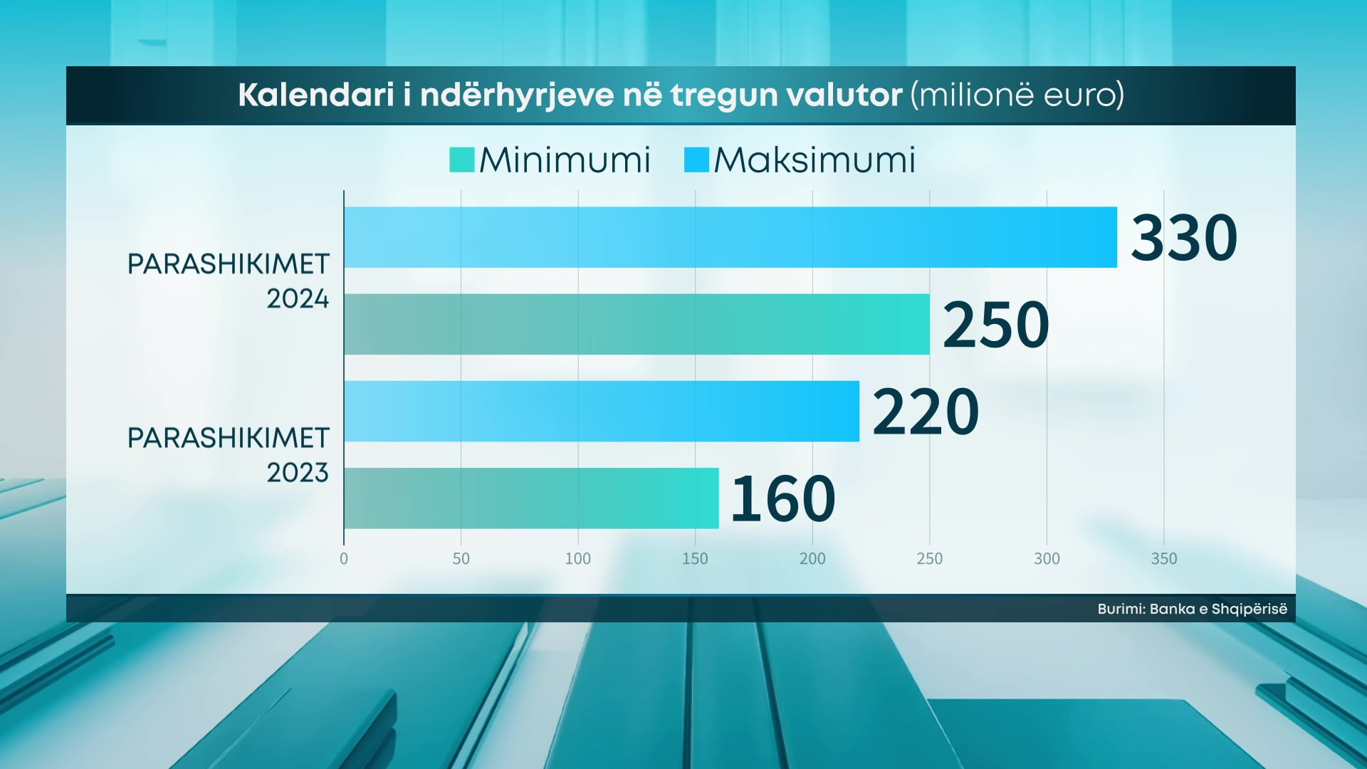 Si çdo fillim viti, Banka e Shqipërisë ka publikuar kalendarin e ndërhyrjeve në tregun valutor. Për këtë vit janë parashikuar në total 20 ankande, përmes të cilëve Banka e Shqipërisë synon të blejë 250-330 milionë euro deri në fund të 2024. Ankandet do të nisin nga mesi i shkurtit dhe do të vijojnë deri më 20 dhjetor. Shuma e blerjes në çdo ankand do të variojë nga 5 deri në 10 milionë euro, ndërkohë që rritja e parashikimeve për ndërhyrje në tregun valutor paralajmëron se Banka e Shqipërisë vijon të presë vijim të tendencës zhvlerësuese të euros në tregun tonë financiar.