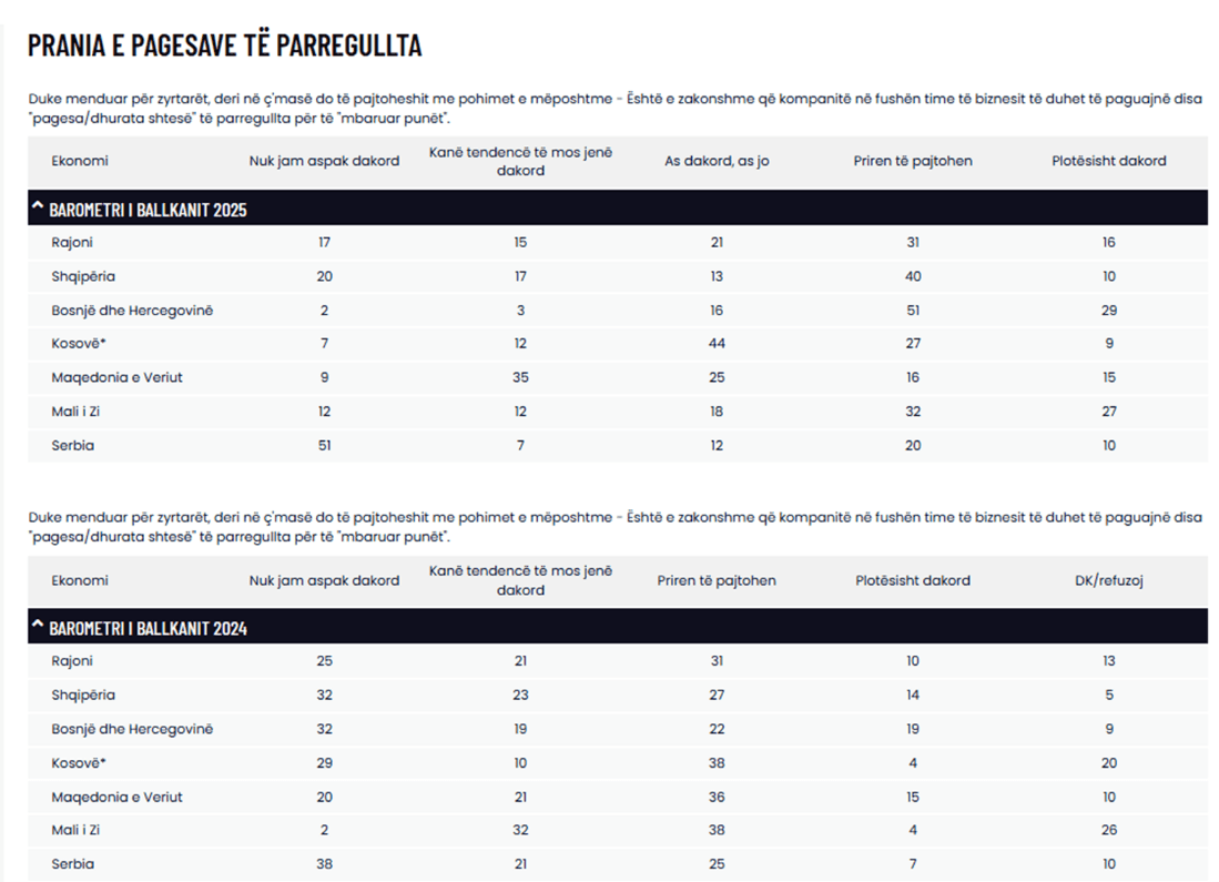 Në vitin 2024, një pjesë më e madhe e bizneseve shprehnin hapur “jo-dakord” me këtë pohim, ndërsa në 2025 pesha e atyre që “nuk janë aspak dakord” apo që “kanë tendencë të mos jenë dakord” bie, duke treguar se rezistenca ndaj normalizimit të ryshfetit po dobësohet. ( shiko grafikun e mëposhtëm).