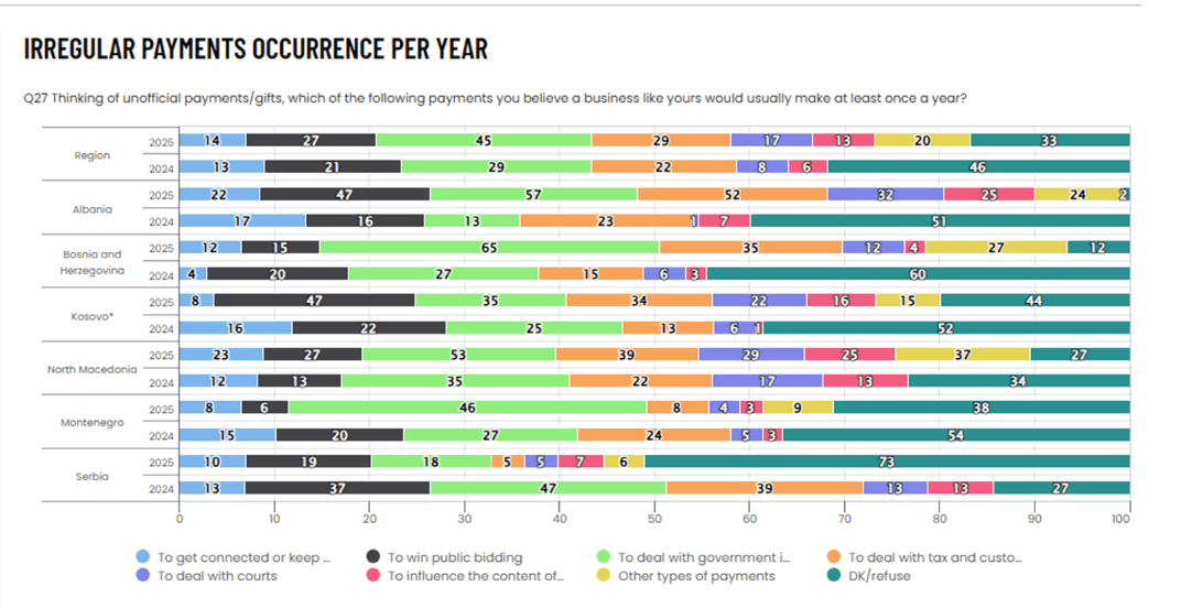 Në vitin 2024, rreth 41% e bizneseve shqiptare shpreheshin se “priren të pajtohen” ose ishin “plotësisht dakord” me pohimin se është e zakonshme të paguhen pagesa apo dhurata shtesë për të mbaruar punët me zyrtarët. Në vitin 2025, kjo përqindje shkon në 50%, me rritje 9 pikë përqindje brenda vetëm një viti të bizneseve që e konsiderojnë ryshfetin si praktikë të zakonshme.