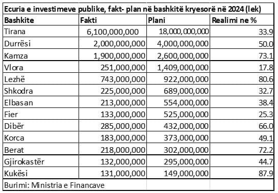 Të dhëna më të detajuara tregojnë se fondin më të madh të investimeve e kishte Bashkia e Tiranës me rreth 18 miliardë lekë më 2024, por ka arritur të investojnë vetëm 6,1 miliardë lekë ose 34 për qind të programit.