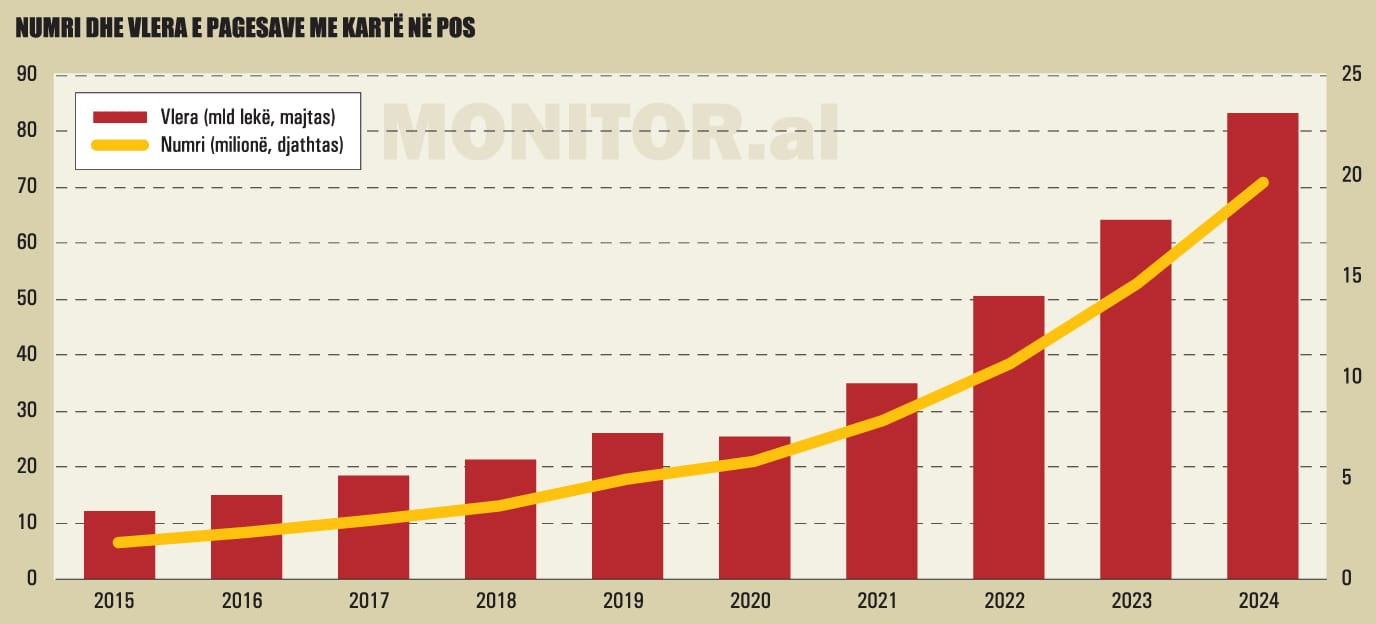 Sipas të dhënave nga Banka e Shqipërisë, në gjashtë muajt e parë të vitit u regjistruan gjithsej rreth 12.57 milionë pagesa me kartë në terminalet elektronike të shitjes (POS). Numri i pagesave me kartë është rritur me 42% krahasuar me gjashtëmujorin e parë të vitit të kaluar.