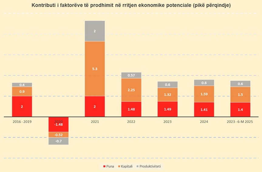Ndërkohë, në periudhën 2023 – 6-mujori 2025, kontributi i faktorit punë ka rënë në 0.4 pikë përqindje, ai kapitalit është rritur në 1.5 pikë përqindje, ndërsa kontributi i produktivitetit është rritur lehtë në 0.6 pikë përqindje.