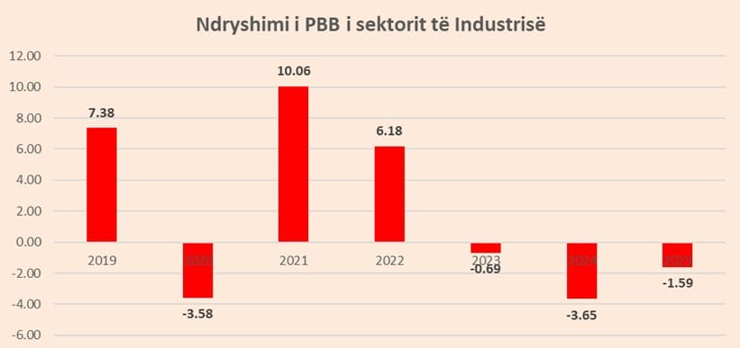 Në të njëjtin trend është edhe industria e cila mbylli vitin e dytë me rënie në 2025 që po vijon tkurrjen edhe këtë vit nisur nga ecuria e dobët e eksporteve në dy muajt e parë.