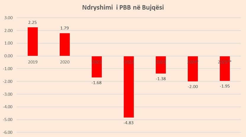 Në vetvete rënia e vazhdueshme e sektorit të bujqësisë e cila mbeti në territor negativ edhe në vitin 2025 reflekton një krizë të thellë kostoje dhe fuqie punëtore. Rritja e çmimeve të inputeve bujqësore, si plehrave kimike dhe naftës, ka ulur rentabilitetin e fermerëve të vegjël, në një kohë që subvencionet e qeverisë janë shumë të ulëta dhe fondet e BE-së nga iPARD mbeten të bllokuara. Më tej, zbrazja e zonave rurale nga emigrimi ka krijuar një mungesë akute të krahut të punës, duke bërë që shumë sipërfaqe toke të mbeten djerrë. Ky sektor, që para pandemisë zinte 20% të ekonomisë, në 2024 zuri vetëm 15.%