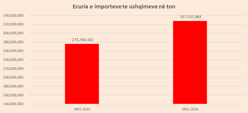 Shporta e konsumit po rrit nga viti në vit varësinë ndaj importeve duke ekspozuar vendin më shumë ndaj krizave të jashtme. Të dhënat zyrtare të INSTAT tregojnë se në 3-mujorin e parë të vitit 2026 ushqimet e importuara u rriten në sasi me rreth 19 për qind.