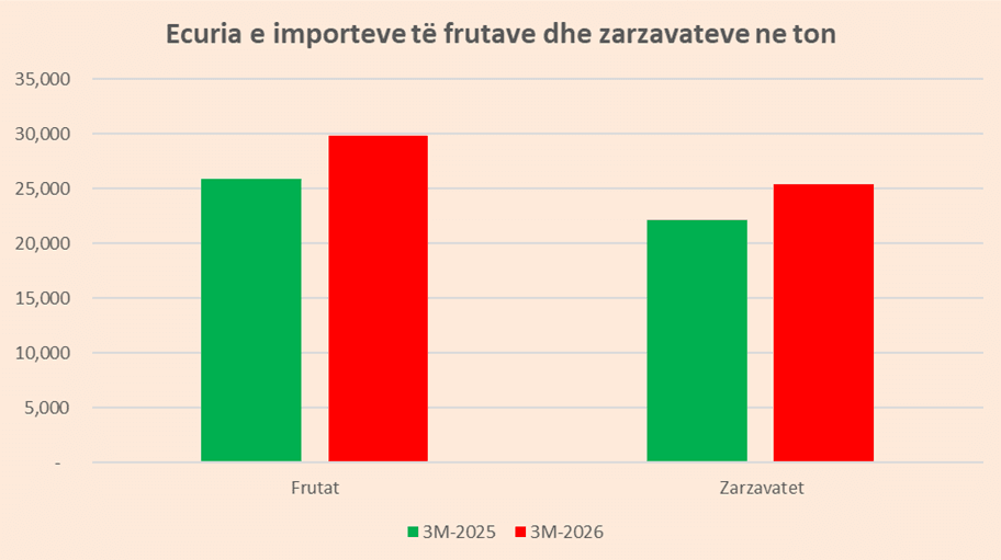 Importet e zarzavateve u rritën me mbi 3,300 tonë në tremujorin e parë 2026, në krahasim me të njëjtën periudhë të një viti më parë duke arritur në një total në mbi 25 mijë tonë. E njëjta tendencë është reflektuar edhe tek frutat, ku sasia e importuar u zgjerua me afro 3,900 tonë, duke kapur shifrën totale prej 29,700 tonësh.