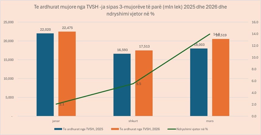 Analiza e të arkëtimeve në tremujorin e parë të vitit 2026 tregon një hov të ardhurash nga TVSH në mars pas dy muajve të zbehtë. Prurjet nga Tatimi mbi Vlerën e Shtuar muajin e kaluar arritën në 20.5 miliardë me rritje vjetore 14%.