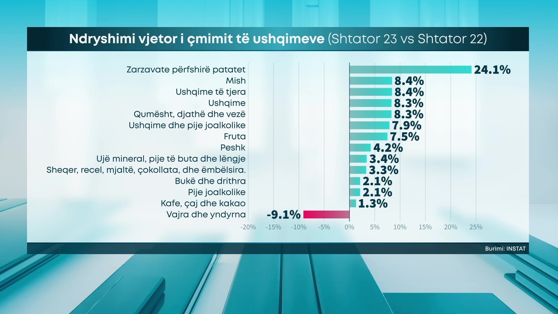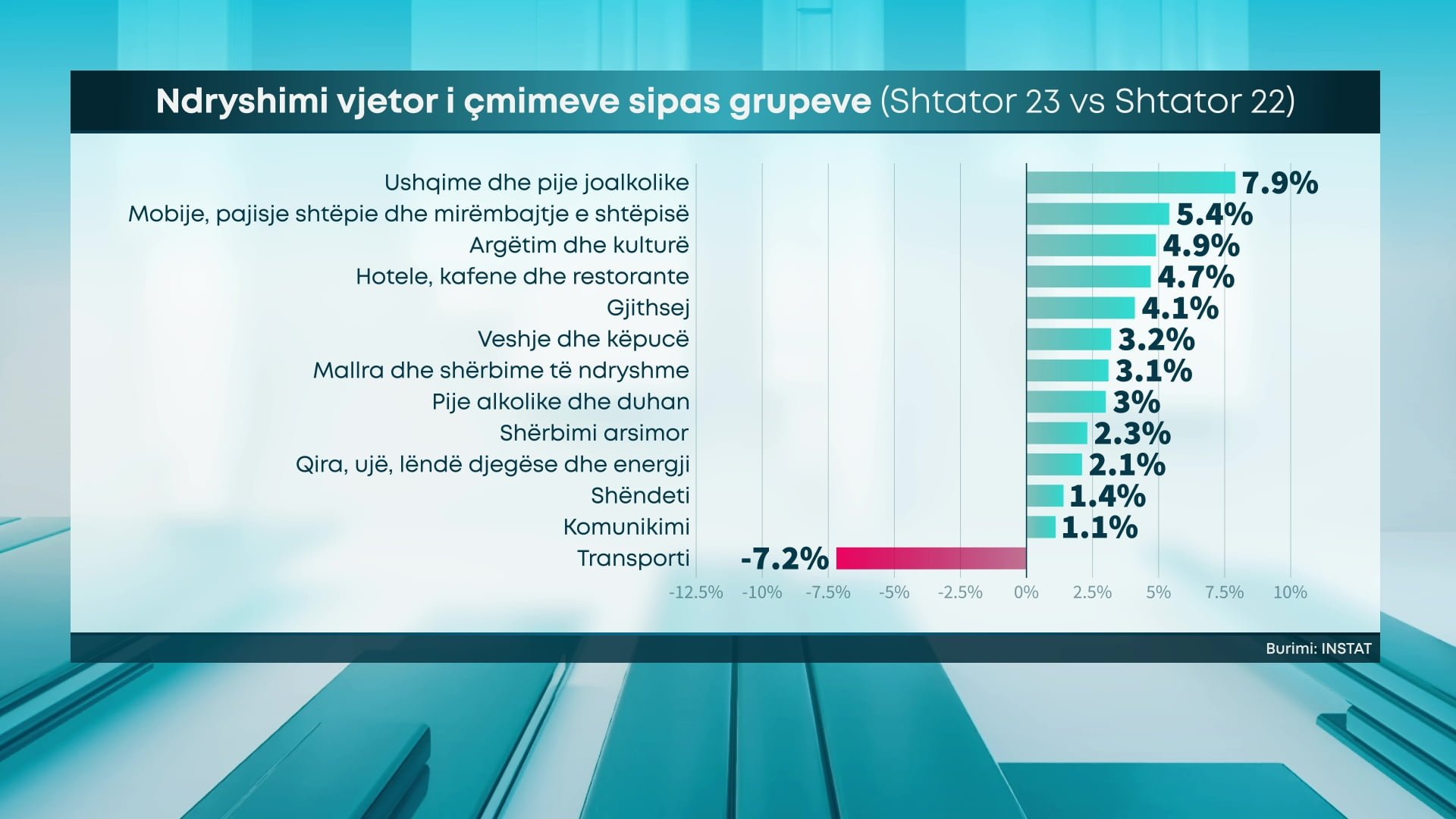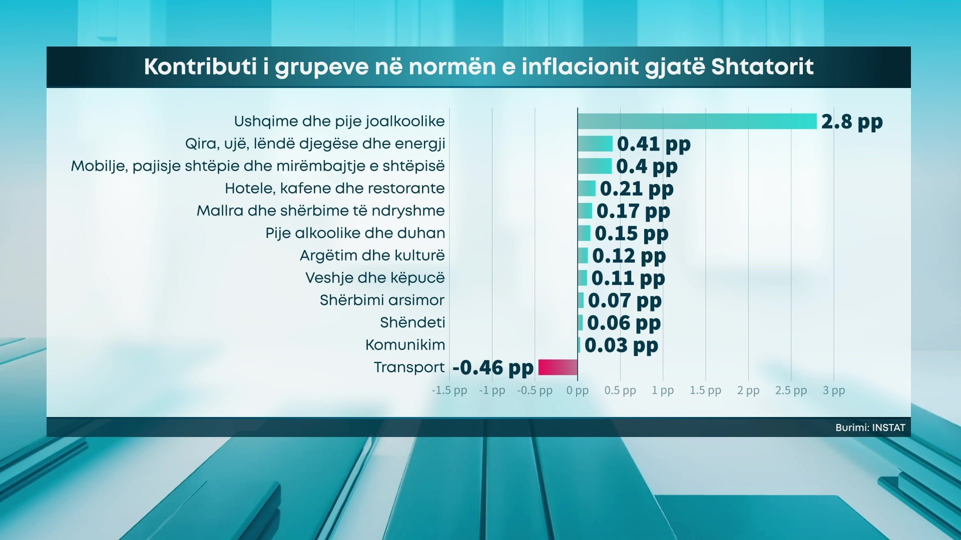 Rritja vjetore e çmimeve në muajin Shtator është ndikuar kryesisht nga grupi “Ushqime dhe pije joalkoolike” me 2.80 pikë përqindje, pasuar nga grupi “Qira, ujë, lëndë djegëse dhe energji” me 0.41 pikë përqindje. Çmimet e grupit “Mobilje, pajisje shtëpie dhe mirëmbajtje e shtëpisë” me 0.40 pikë përqindje. Çmimet e grupit “Hotele, kafene dhe restorante” me 0.21 pikë përqindje. Nga ana tjetër, çmimet e grupit “Mallra dhe shërbime të ndryshme” kontibuan me 0.17 pikë përqindje. Çmimet e grupit “Pije alkoolike dhe duhan” me 0.15 pikë përqindje. Sipas shifrave grupi i transportit është i vetmi grup që ka ndikuar negativisht me 0.46 pikë përqindje.