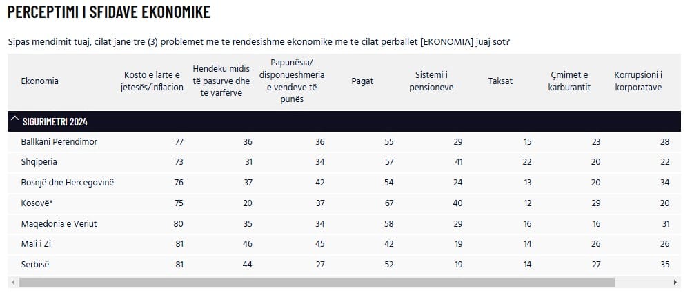 Një anketë e fundit për sigurinë në Rajon që e u krye nga Këshilli i Bashkëpunimit Rajonal (RCC) zbuloi se tre problemet më të rëndësishme në aspektin ekonomik për shqiptarët janë çmimet e larta, pagat e ulëta dhe pensionet e ulëta.