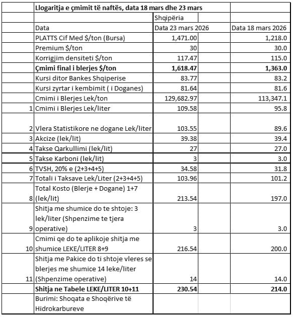 Sipas të dhënave nga Shoqata e Shoqërive të Hidrokarbureve, në datën 18 mars, kur çmimi i naftës në vend me pakicë kërceu në 214 lekë, Platts në bursa ishte rreth 1300 dollarë për ton, që i korrespondonte një çmimi në doganë prej rreth 96 lekë për litër, të cilës i shtohen dhe rreth 100 lekë taksa e marzhe operacionale të tjera prej 3 lekë të shumicës dhe 14 lekë të pakicës.