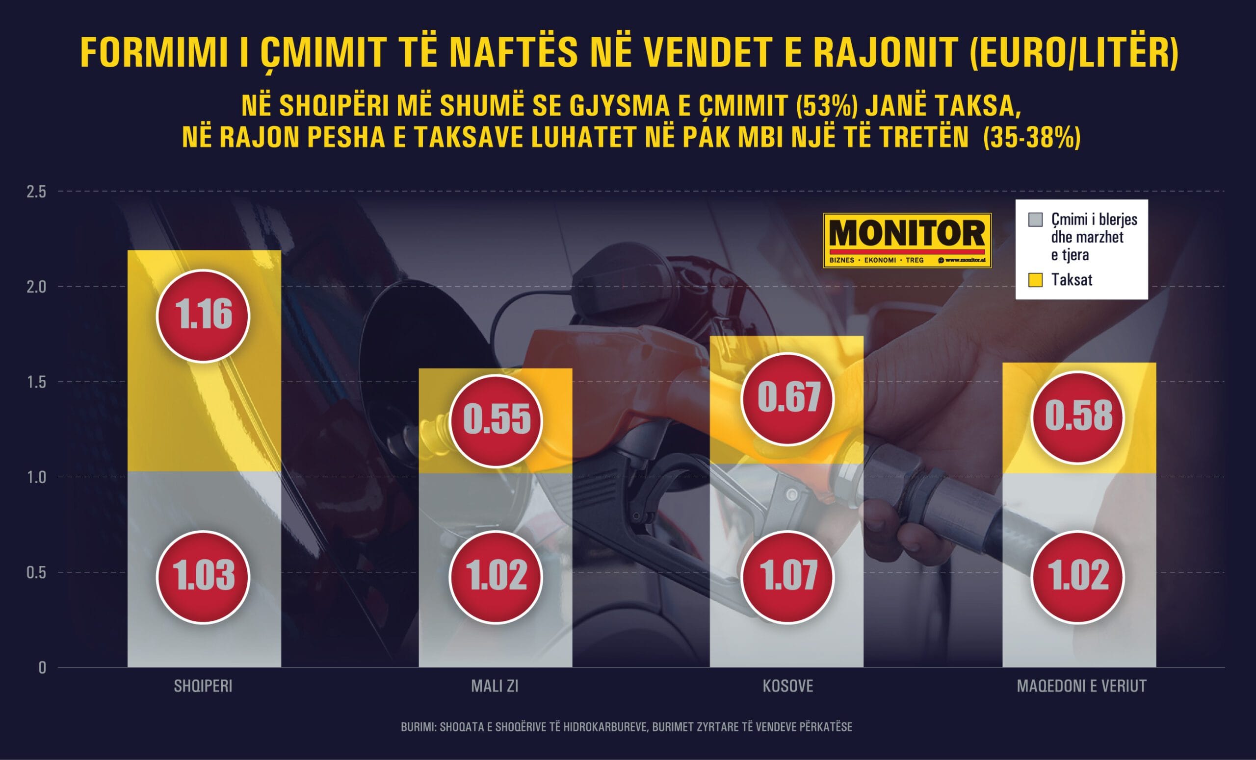 Në total, aktualisht, një shqiptar paguan në një litër naftë 1.16 euro taksa, (53% të çmimit final); një qytetar maqedonas 0.58 euro për litër (36% të çmimit final); një malazez 0.55 euro (35% të çmimit final); një shtetas i Kosovës 0.67 euro, ose 38.5% të çmimit final.