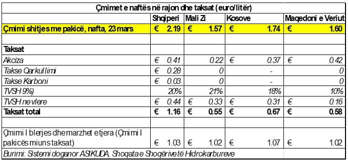 Në Shqipëri, elementi që shton më shumë barrën fiskale është taksa e qarkullimit prej 27 lekë për litër. Akciza është fikse, 39.4 lekë për litër dhe 3 lekë është taksa e karbonit. Mbi këto llogaritet TVSH-ja, që është 20% mbi çmimin final (përfshirë taksat e tjera), ndryshe nga rajoni që TVSH nuk e ngarkon mbi taksat e tjera.