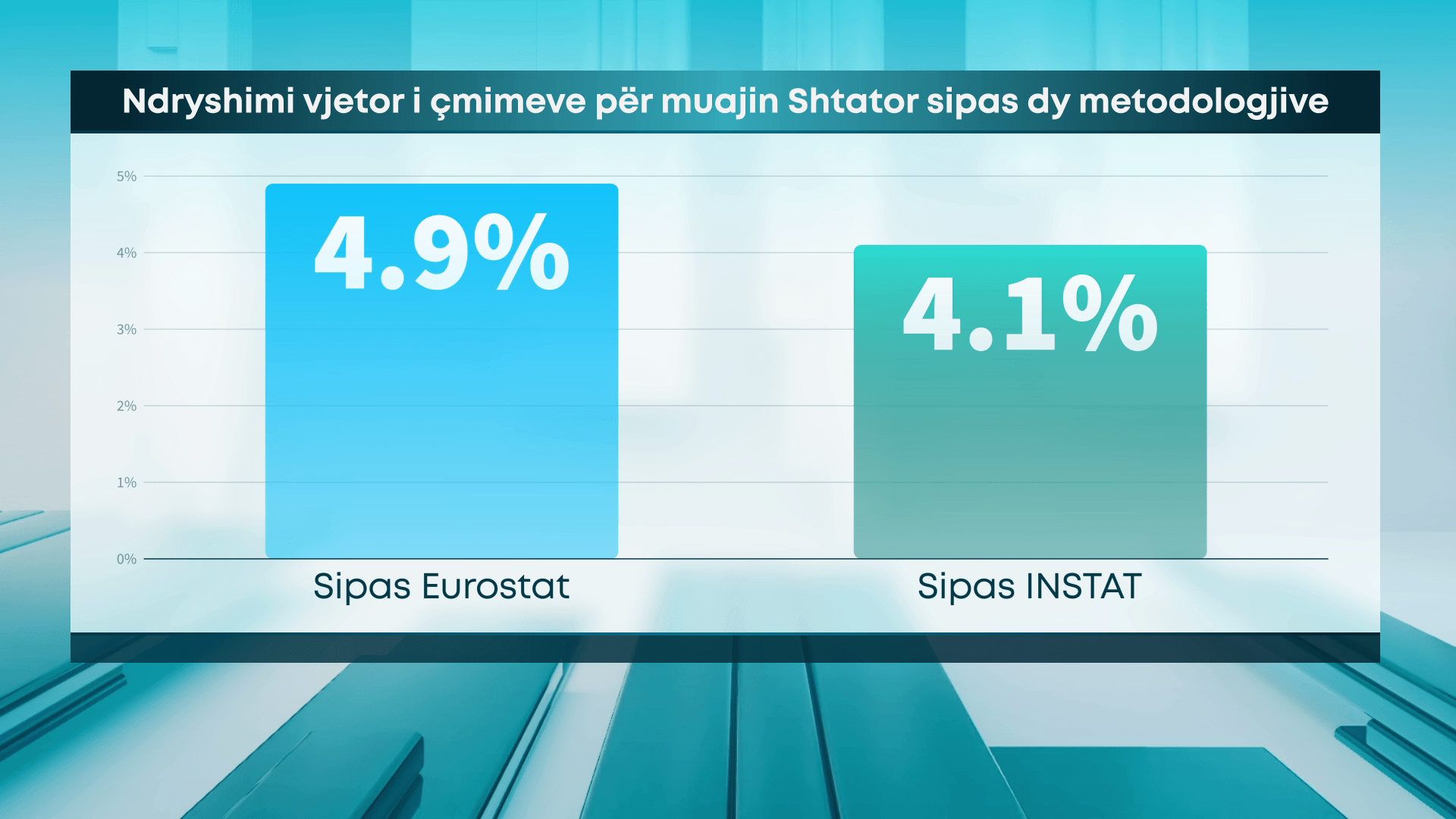 Ndërkohë që norma e inflacionit regjistroi rritje për muajin shtator, të dhënat sa i përket rritjes së çmimeve tregojnë së edhe inflacioni sipas mestodës së ‘Eurostat’ ka shënuar rritje po për të njejtin muaj. Indeksi i Harmonizuar i Çmimeve të Konsumit për muajin shtator të vitit 2023, që mat rritjen e çmimeve sipas metodës së ‘Agjencisë Europiane të Statistikave’, fiksohet në 4.9%, ndërkohë që sipas metodës së Instat, po për të njejtin muaj fiksohej në 4.1%. Rikujtojmë se në muajin Gusht ky tregue regjistrohej në 4.7%.