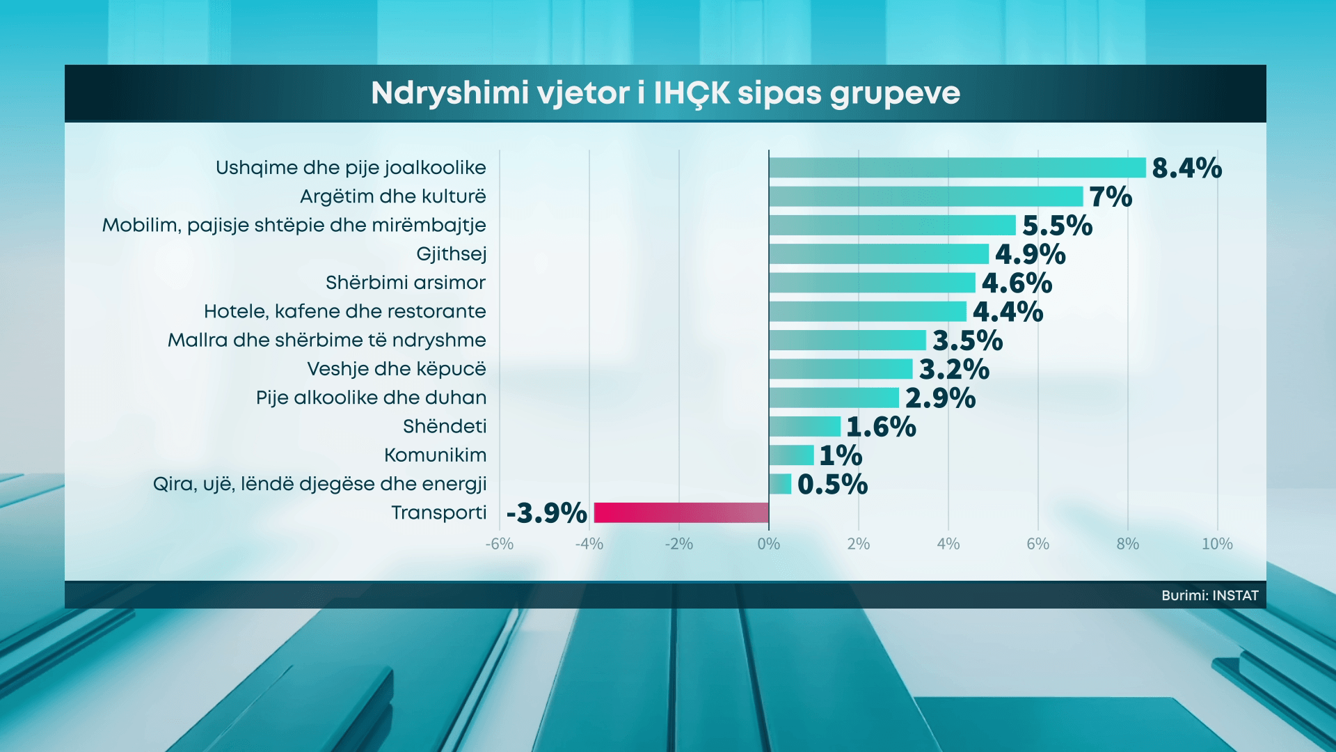 Rritja më e madhe e çmimeve prej 8.4% vërehet në grupin “Ushqime dhe pije joalkoolike”, pasuar nga grupet “Argëtim dhe kulturë” me 7.0%, “Mobilim, pajisje shtëpie dhe mirëmbajtje” me 5.5%, “Shërbimi arsimor” me 4.6%, “Hotele, kafene dhe restorante” me 4.4%, “Mallra dhe shërbime të ndryshme” me 3.5%, “Veshje dhe këpucë” me 3.2%, “Pije alkoolike dhe duhan” me 2.9%, “Shëndeti” me 1.6%, “Komunikimi” me 1.0%, “Qira, ujë, lëndë djegëse dhe energji” me 0.5%. Nga ana tjetër, çmimet e grupit “Transporti” u ulën me 3.9%.