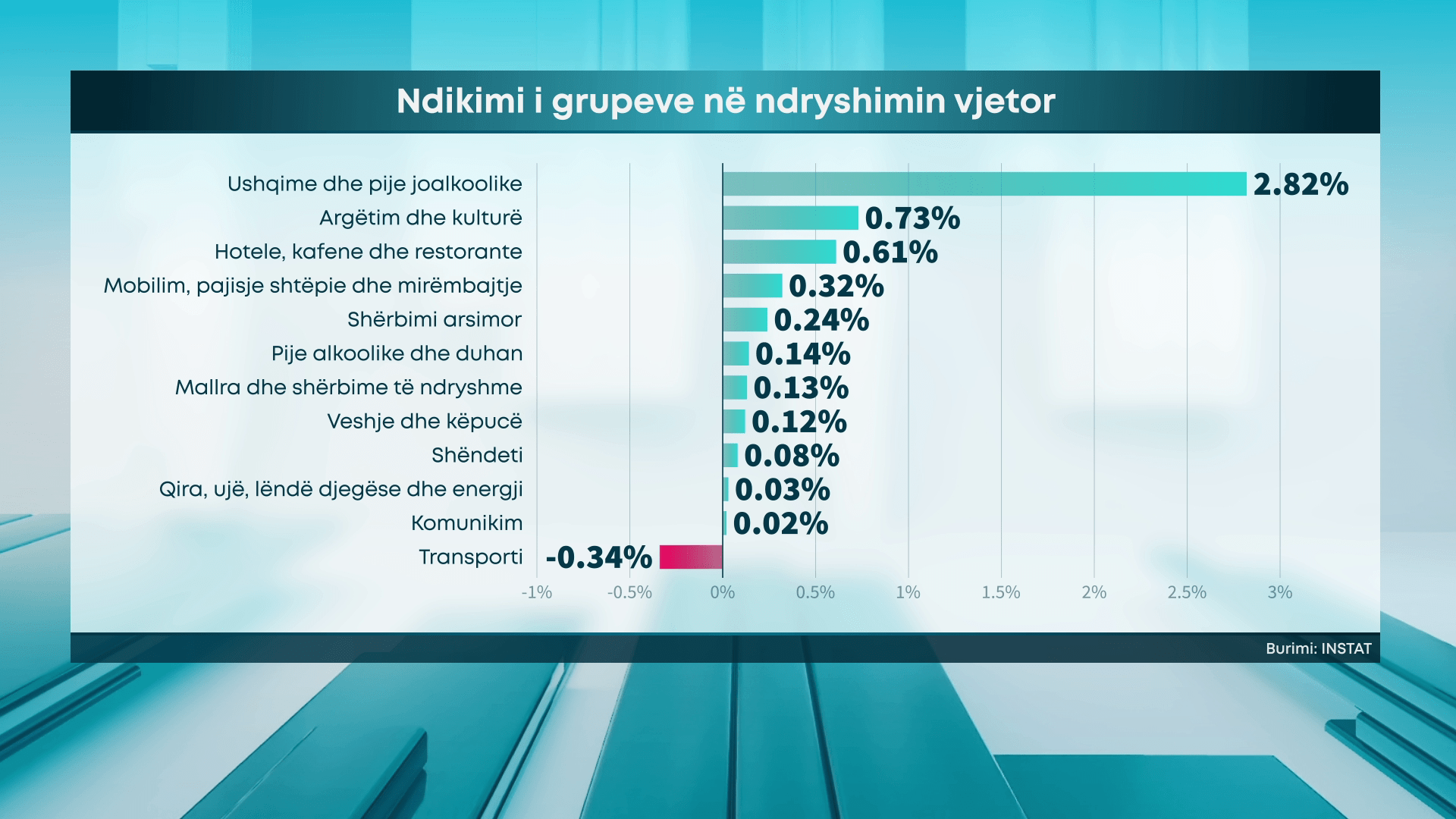 Sa i përket kontributit të grupeve, ndikimin më të madh e ka patur grupi “Ushqime dhe pije joalkolike” me 2.82 pikë përqindje, pasuar nga grupi “Hotele, kafene e restorante” dhe “Argëtim dhe Kulturë” me 0.61 pikë përqindje dhe 0.73 pikë përqindje. Kontribut negativ ka dhënë vetëm grupi “Transporti” me 0.34 pikë përqindje.