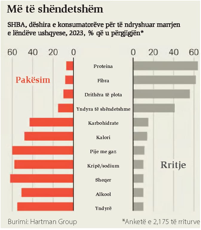Kërkimet në Google për “dietë me proteina të larta” arritën pikën më të lartë në janar. Rreth 64% e amerikanëve duan të rrisin sasinë e proteinave që hanë, sipas shoqërisë kërkimore Hartman Group, duke lënë pas lëndët ushqimore që janë parapëlqyer historikisht, si fibrat dhe drithërat (shih grafikun).
