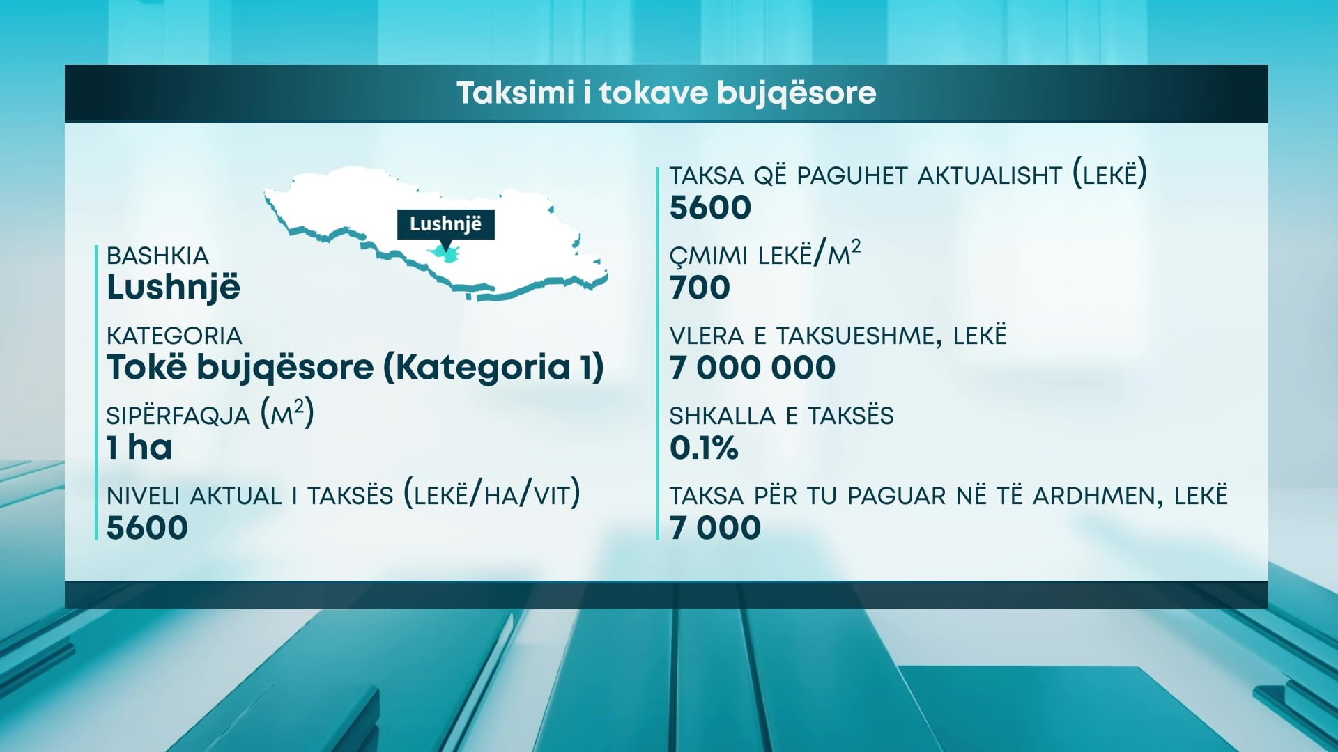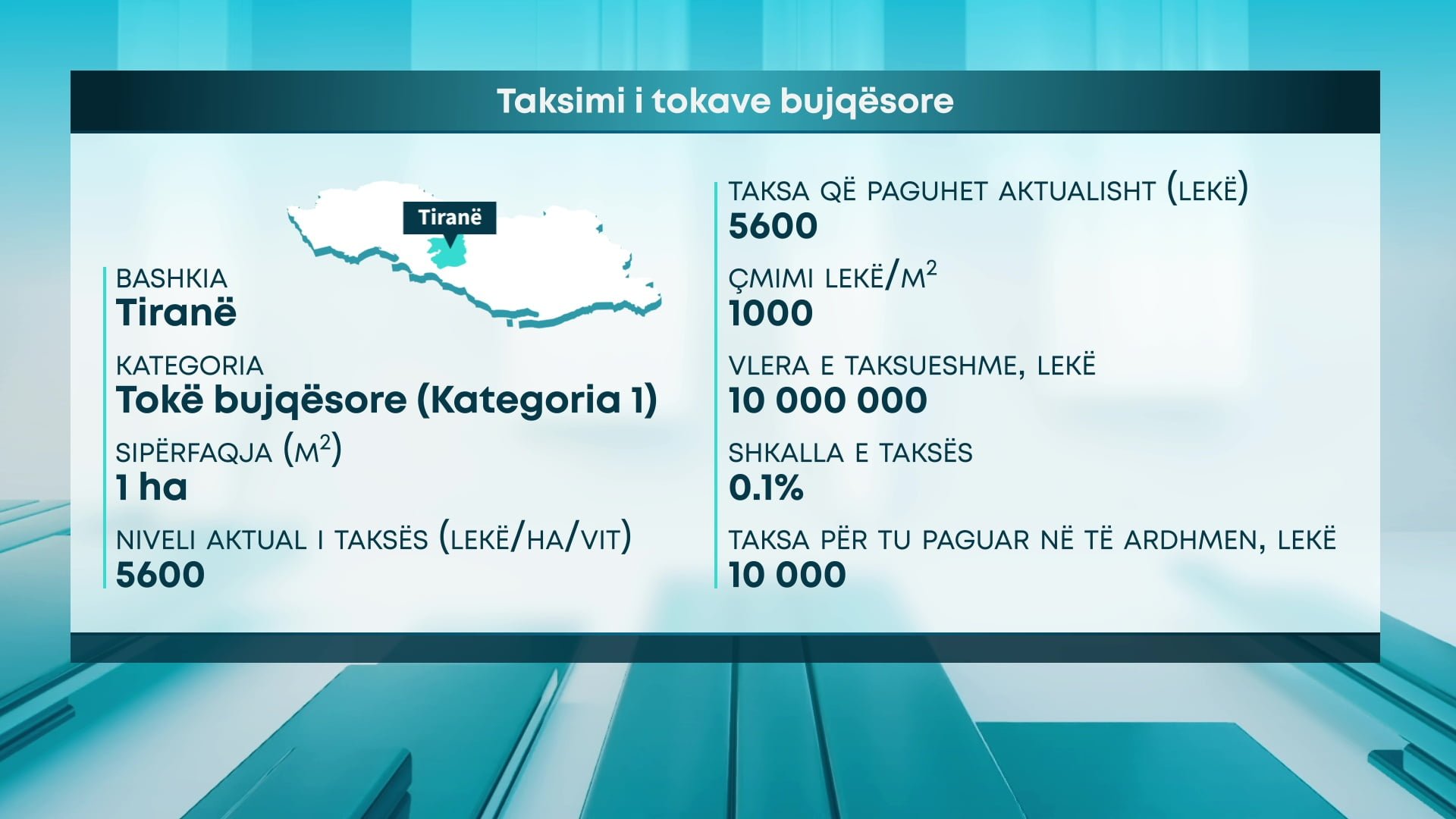 Konkretisht, në Bashkinë Tiranë, për toka bujqësore, kategori e parë, me një sipërfaqe 1 hektarë, niveli aktual i taksës është 5600 lekë për ha në vit. Duke marrë në konsideratë çmimin 1000 lekë/m2, vlera e taksueshme është 10 milionë lekë, niveli i propozuar i taksës 0.1 %, dhe taksa për tu paguar në të ardhmen rezulton 10 mijë lekë.