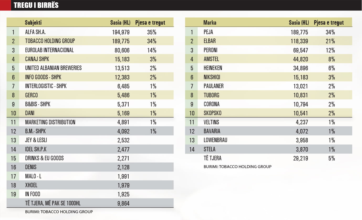 Nga markat, më e shitura është birra “Peja”, me 35% të totalit, e ndjekur nga “Elbar” (21%), “Peroni” (12%), “Amstel” (8%), “Heineken” (6%).