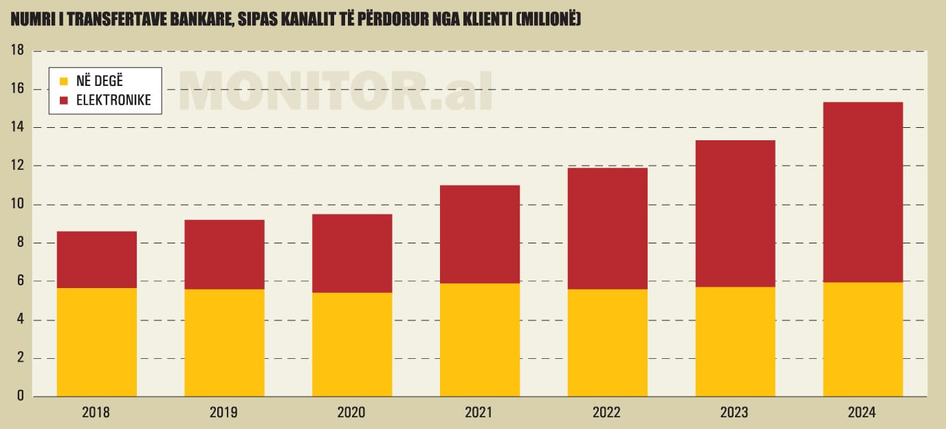 Për të gjithë 6-mujorin 2025, pesha e veprimeve nga kanalet elektronike është rritur në 64% të totalit, ndërsa në gjysmën e parë të vitit të kaluar, ato përbënin rreth 59% të numrit të përgjithshëm të transfertave bankare.