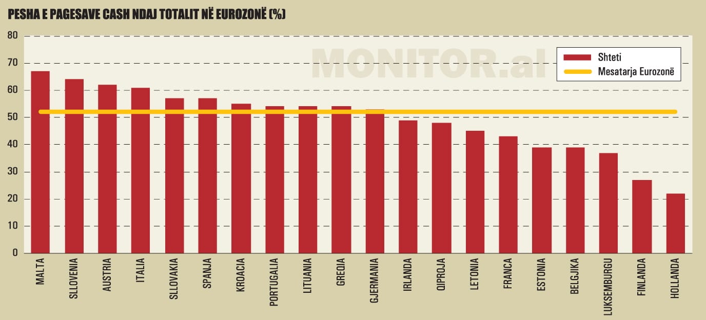 Në 14 nga 20 vendet e Eurozonës, paraja cash është metoda më e përdorur e pagesës dhe përbën midis 45% dhe 55% të transaksioneve në gjysmën e vendeve anëtare.
