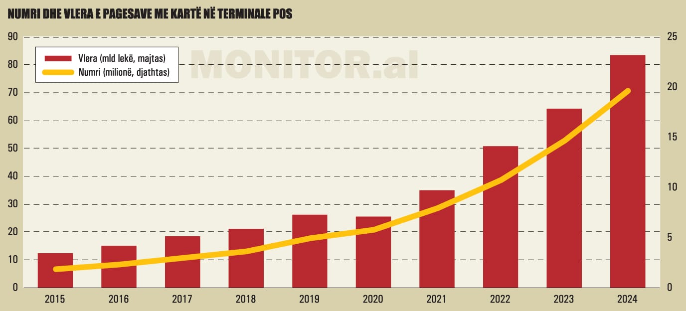Në një horizont kohor më afatgjatë, rritja është shumë e lartë. Një dekadë më parë, më pak se 10% e veprimeve me karta ishin pagesa në POS.