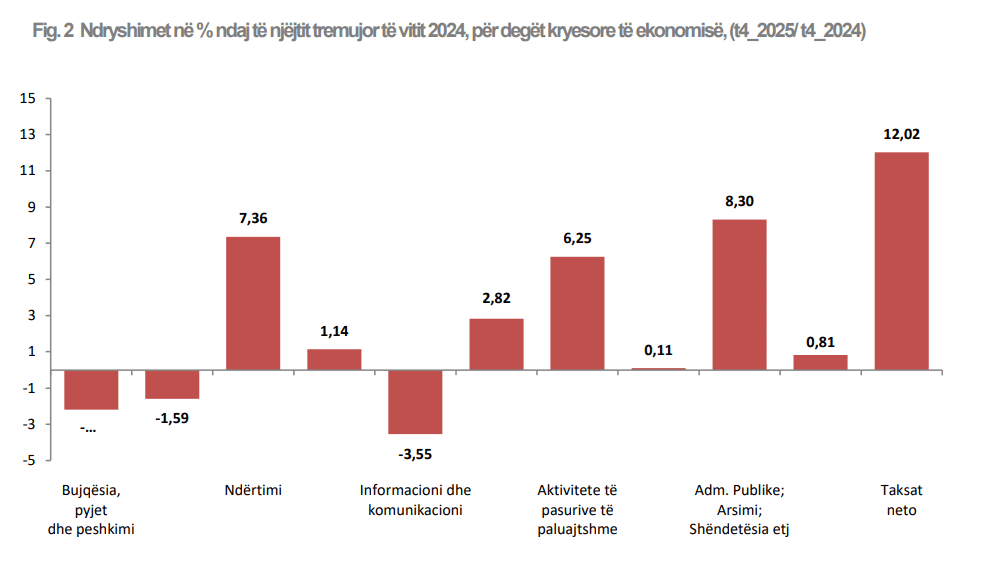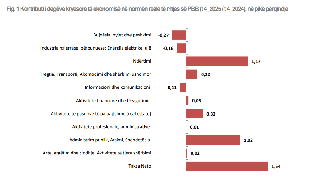 Në tre tremujorët e parë, ndikimin kryesor në rritje e kishte dhënë administrata publike dhe taksat neto. Ndërsa në tremujorin e katërt, një kontribut të rëndësishëm ka dhënë dhe ndërtimi.