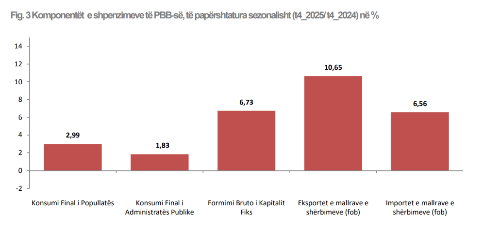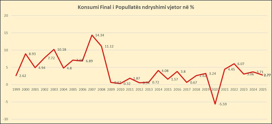 Ndonëse sipas të dhënave të tjera të bankës së Shqipërisë, 2025-a ishte një vit rekord për të ardhurat nga turizmi, arritën një rekord prej 5.7 miliardë lekësh në vend, ndikimi i aktivitetit “Tregtia, Transporti, Akomodimi dhe shërbimi ushqimor” që do të ndikohej direkt nga konsumi i të huajve ka qenë minimal në të gjithë tremujorët. Në tremujorin e tretë, psh, kontributi i këtij zëri ishte 0.62 pikë përqindje, nga 3.75% që ishte rritja totale, ndërsa në të katërtin 0.22 pikë përqindje, nga 3.79% rritja totale. Edhe konsumi final i popullatës për gjithë vitin ishte 2.77%, më i ulëti pas pandemisë, dhe përjashtuar pandeminë, më i ulëti nga 2018-a.