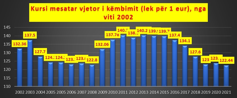 Në vitin 2021, një euro u këmbye si mesatare vjetore me 122.44 lekë në tregun e brendshëm, duke shënuar nivelin më të ulët historik si mesatare vjetore, që nga viti 2002, kur monedha e përbashkët filloi të tregtohej fizikisht, sipas të dhënave të Bankës së Shqipërisë, të përpunuara nga “Monitor”.