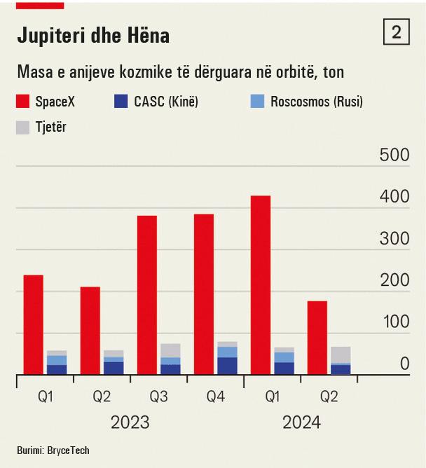 Sipas të dhënave nga firma BryceTech, në tremujorin e parë të këtij viti, firma dërgoi pothuajse shtatë herë më shumë objekte në orbitë sesa të gjithë rivalët e saj së bashku, qofshin ato firma private apo programe kombëtare hapësinore (shih grafikun 2).