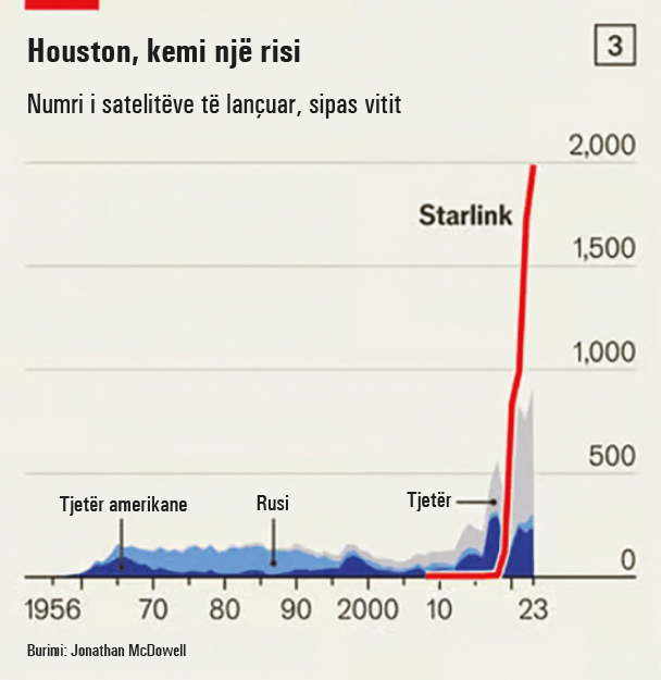 Sipas Jonathan McDowell nga Qendra për Astrofizikën, rreth 6400 satelitët Starlink të lëshuar që nga viti 2019, përbëjnë rreth tre të katërtat e të gjithë satelitëve që janë aktivë në hapësirë (shih grafikun 3). SpaceX ka plane të forta për të vendosur 12,000 satelitë dhe ka aplikuar për të lëshuar deri në 42,000 satelitë.