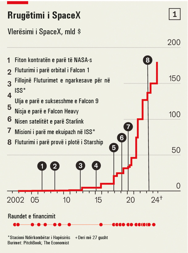 Falë perspektivave të Starlink, vlerësimi i kompanisë SpaceX është rritur në 180 miliardë dollarë (shih grafikun 1). Disa analistë madje kanë filluar të pyesin nëse një ditë kjo kompani mund të arrijë apo edhe të kalojë vlerën e Tesla-s, një kompani e makinave elektrike, që zotërohet gjithashtu nga Elon Musk.