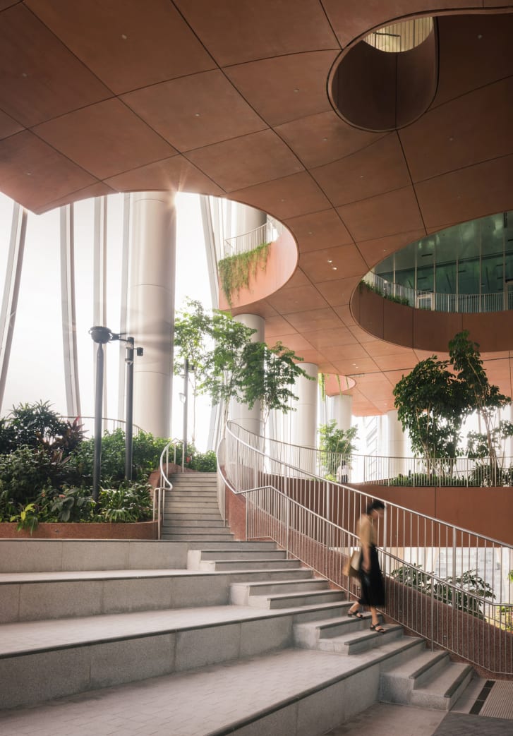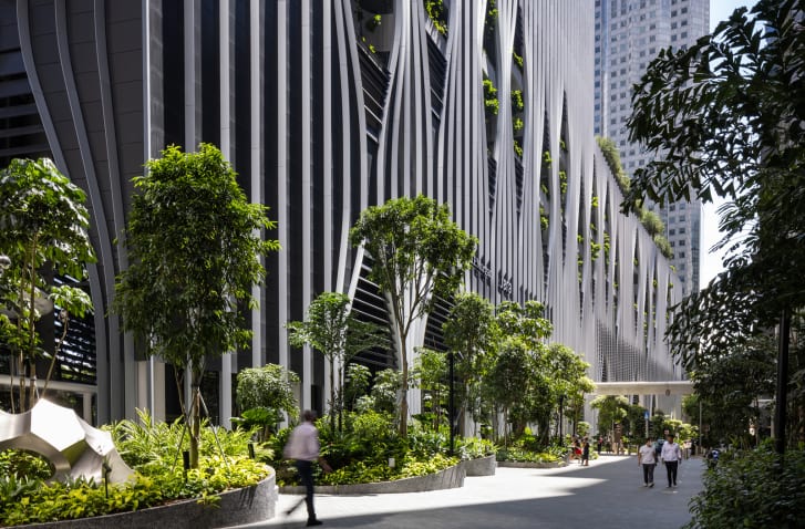 Një e treta e rrugës deri në kullën CapitaSpring të përfunduar së fundmi, fasada e lartë e xhamit dhe aluminit duket se shpërthen për të zbuluar bimë dhe pemë që rriten qindra metra mbi tokë. Në nivelin e rrugës, kalimtarët dhe punonjësit e zyrës mund të rreshtohen për një ashensor që të çon në këtë të ashtuquajtur “Oazë të Gjelbër”, një shteg kopshti spirale që kalon pranë pajisjeve të stërvitjes, stolave dhe tavolinave në udhëtimin e tij nëpër katër kate të florës tropikale.