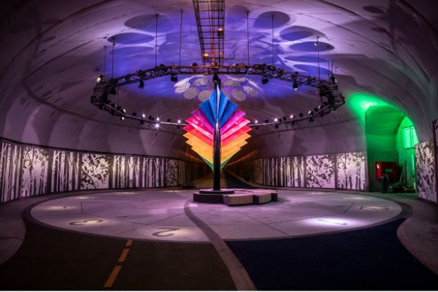 Duhen pak më pak se 10 minuta për të kaluar nëpër tunel me biçikletë dhe rreth 40 minuta nëse ecni në këmbë. Për të thyer monotoninë e tunelit pa dritare, ka një sërë instalimesh arti në të gjithë, si dhe ngjyra dhe ndriçim të ndryshëm për të ndihmuar përdoruesit të vendosin vendin ku janë në udhëtim dhe të ofrojnë një ndjenjë drejtimi.