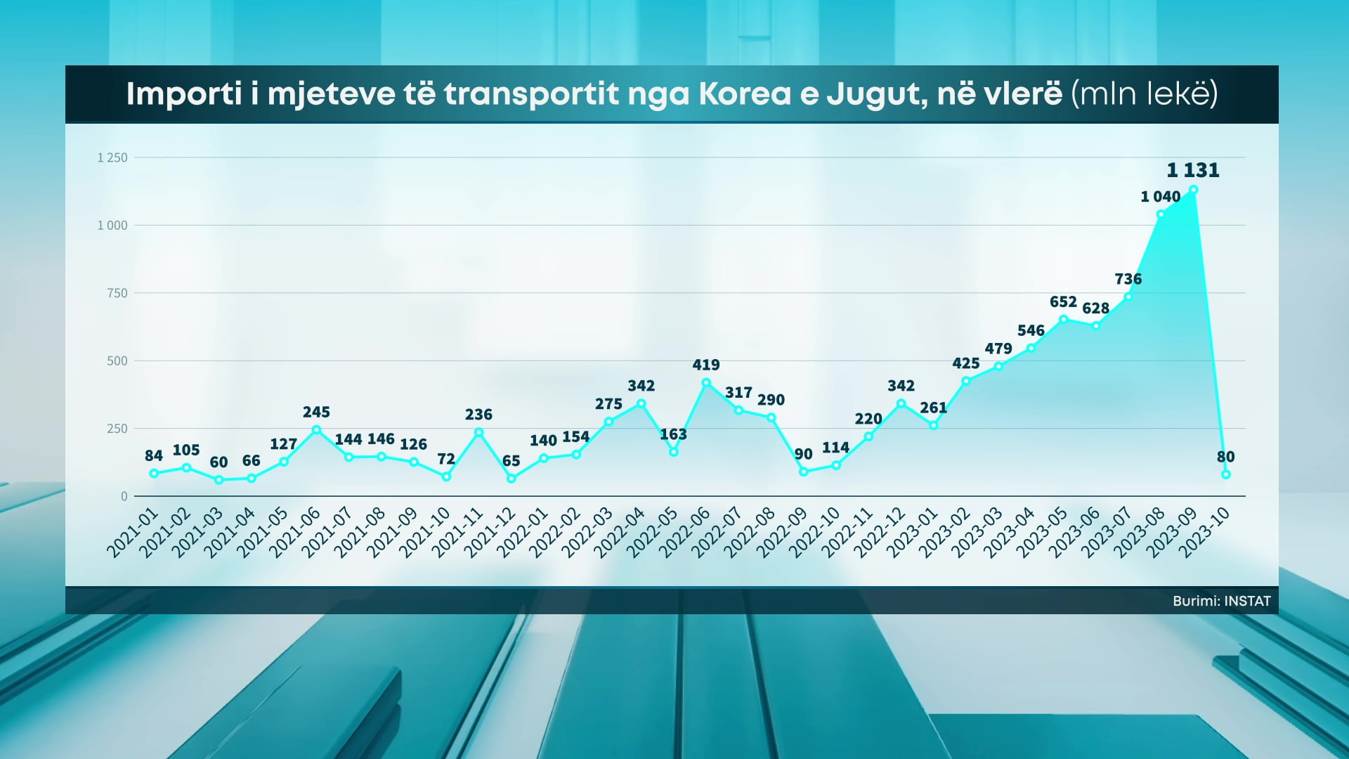 ka analizuar të dhënat e INSTAT, ku rezulton se në vitet 2021-2022 importi mujor i mjeteve të transportit nga Korea e Jugut varionte nga 100 deri në maksimumi 400 milion lekë. Totali vjetor i importeve arrinte në 3 miliardë lekë.