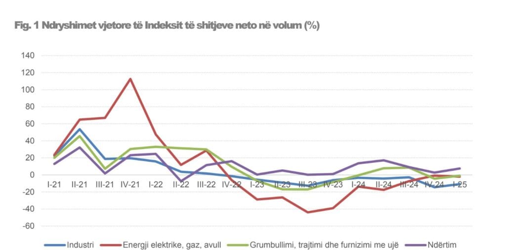 Sektori i prodhimit shënoi rënie të fortë për sektorin e industrisë dhe rritje të qëndrueshme për ndërtimin në tremujorin e parë 2025. Treguesit e shitjeve në industri ranë me 10 për qind duke reflektuar dobësitë në eksporte të sektorin dhe falimentin në këtë sektor.