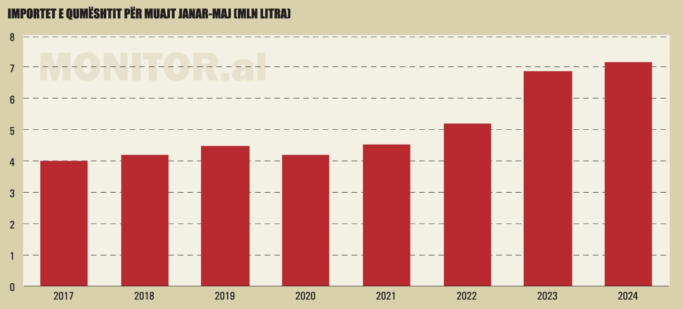 Sipas të dhënave të doganave, për 2024 u importuan 22,8 milionë litra qumësht, me një rritje të fortë prej 23% me bazë vjetore.