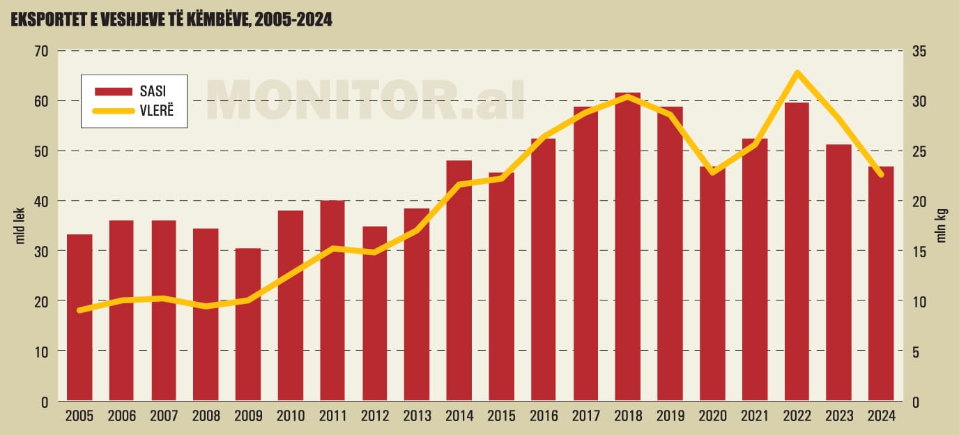 Në vitin 2024, eksportet e veshjeve të këmbëve ranë me 8.2% në sasi dhe 19.4% në vlerë, të ndikuara nga vijimi i nënçmimit të Euros, shtimi i kostove nga pagat e larta, ndryshimi i kërkesës globale për këpucë për shkak të motit të ngrohtë dhe zhvendosjes së prodhimit të sipërmarrjeve europiane drejt vendeve me kosto më të lira të punës, si India e shtete të tjera të Azisë.