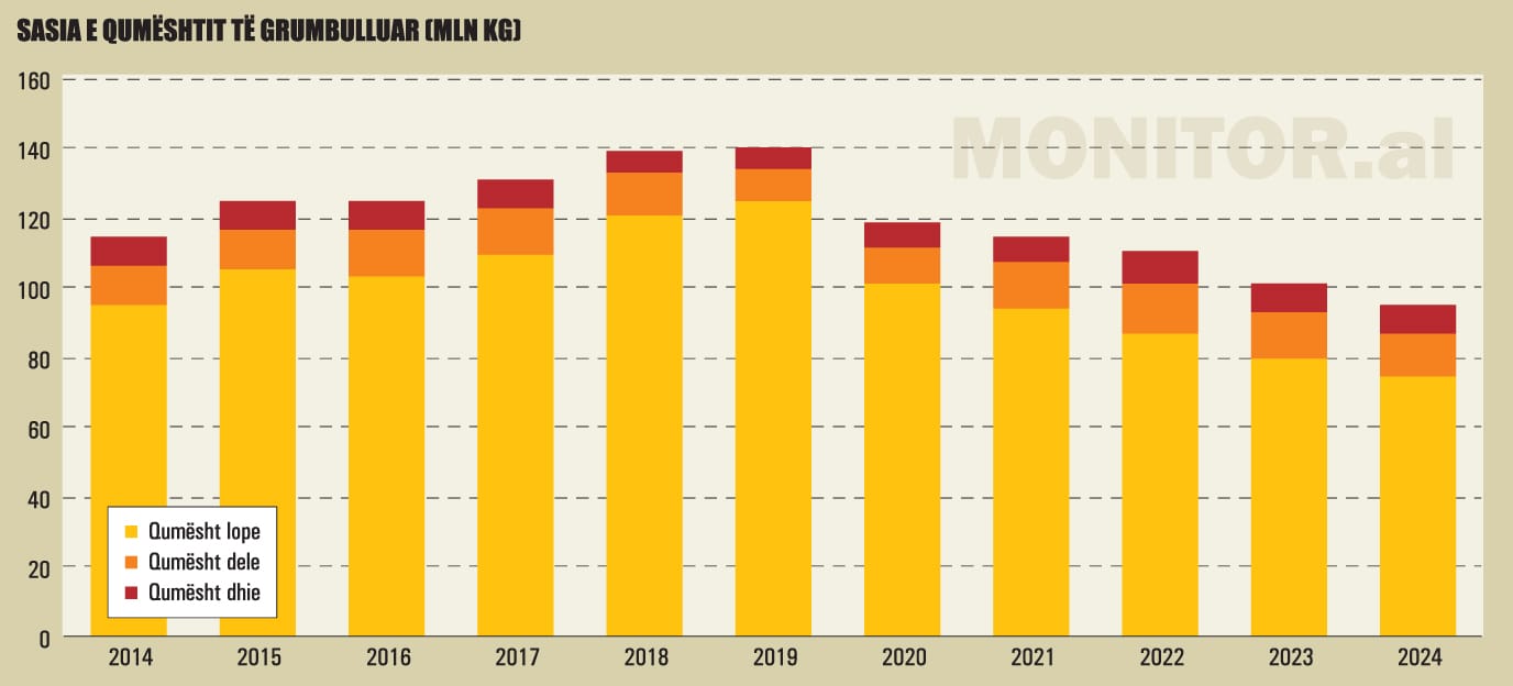INSTAT raportoi se sasia e qumështit të grumbulluar ra me 6.6% në vitin 2024, duke arritur nivelin më të ulët historik, të paktën që nga 2014-a, kur raportohen të dhënat.