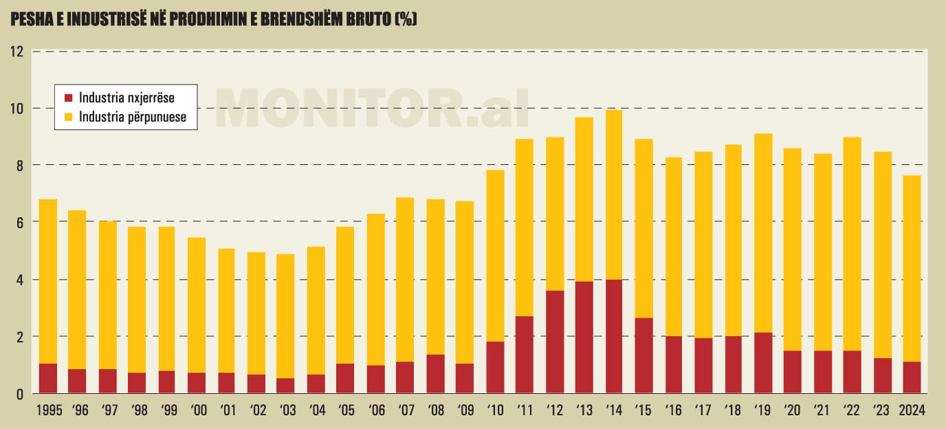 Kriza e sektorit ka bërë që kontributi i industrisë në ekonomi të vijë në rënie të vazhdueshme. Në 2024-n, pesha e industrisë në Prodhimin e Brendshëm Bruto (PBB) zbriti në 7.6%, nga 8.47% vitin e mëparshëm, sipas të dhënave të INSTAT.