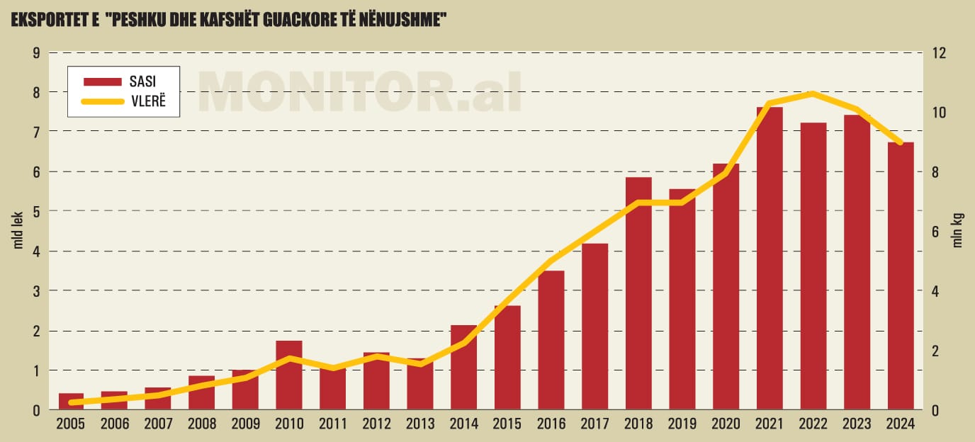 Sipas INSTAT, në vitin 2024, eksportet e grupit “Peshku dhe kafshët guaskore të nënujshme”, ranë me 9.2% në sasi dhe 10.8% në vlerë, duke shënuar tendencën më negative që nga viti 2013, kur kishte filluar zgjerimi i vrullshëm i sektorit.